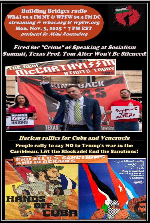 Host Mimi Rosenberg speaks with labor historian Professor Tom Alter about his summary firing from Texas State University after a deceptively edited clip of an off-campus talk—situating his case within a broader wave of repression against academic freedom, DEI, and pro-Palestine speech. The conversation traces historical precedents for today’s “neo-McCarthyism,” the targeting of universities, and the double standard around “free speech” on campus. In part two, Mimi brings us to a Harlem rally demanding hands off Venezuela and lift the blockade on Cuba, featuring statements from Friends of the Congo, Puerto Rican youth organizers, and defenders of Cuba’s medical brigades, tying sanctions to global struggles for sovereignty and justice—and offering concrete ways to act.